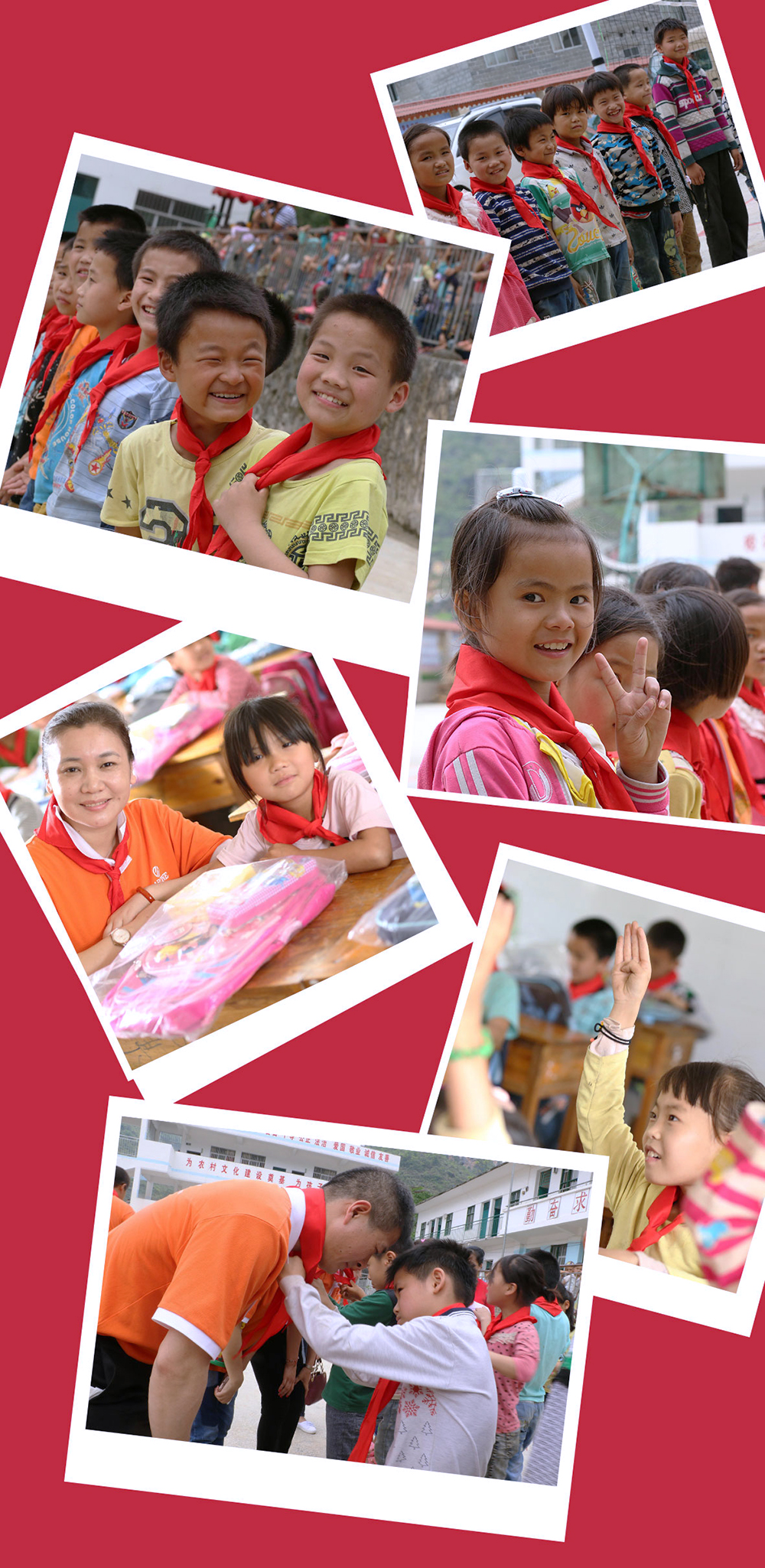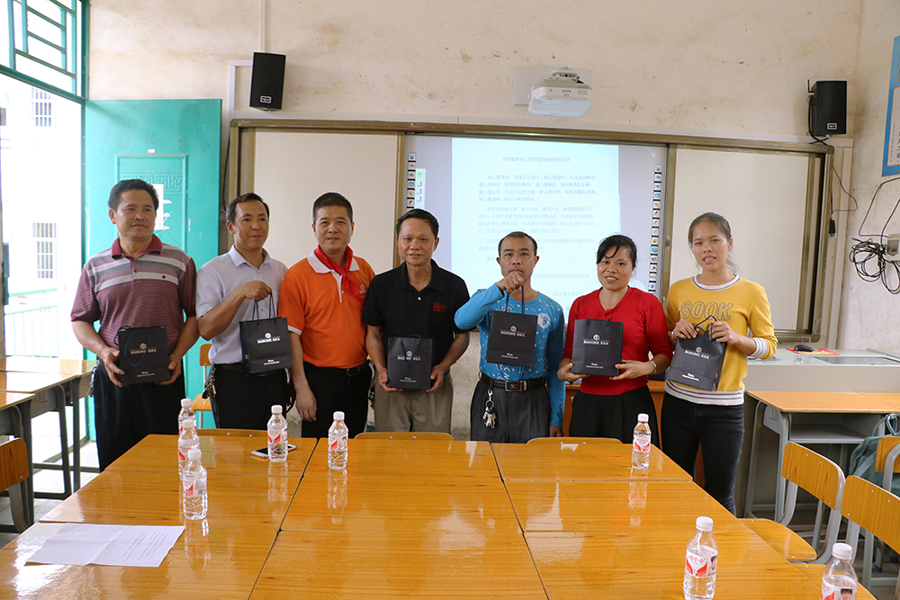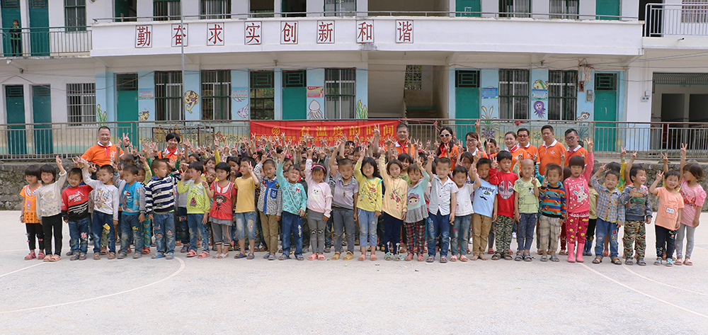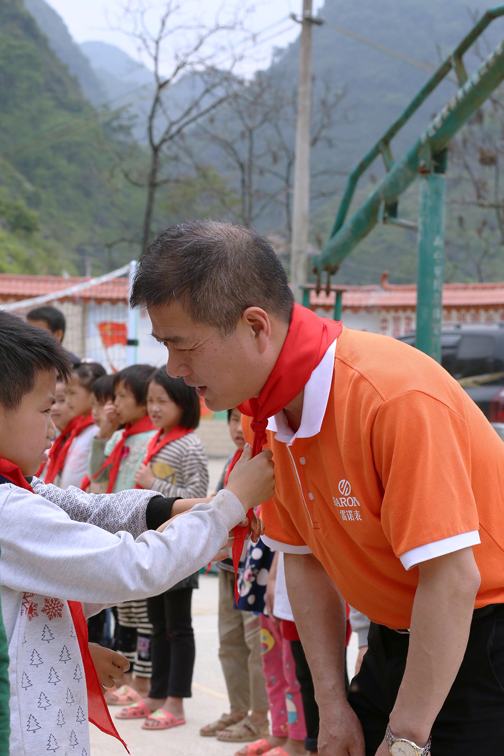 General Manager Mr. Zhan Jiangzhou with Rarone team started from Nangning, with a beautiful natural scenery. After more than 3 hours of long trekking, our team finally arrived at the Tongshe village primary school along the zigzagged mountain path, and children were waiting for us at the school gate.An enormous stronger sense of mission come to our each heart when bring a bright red scarf by children.