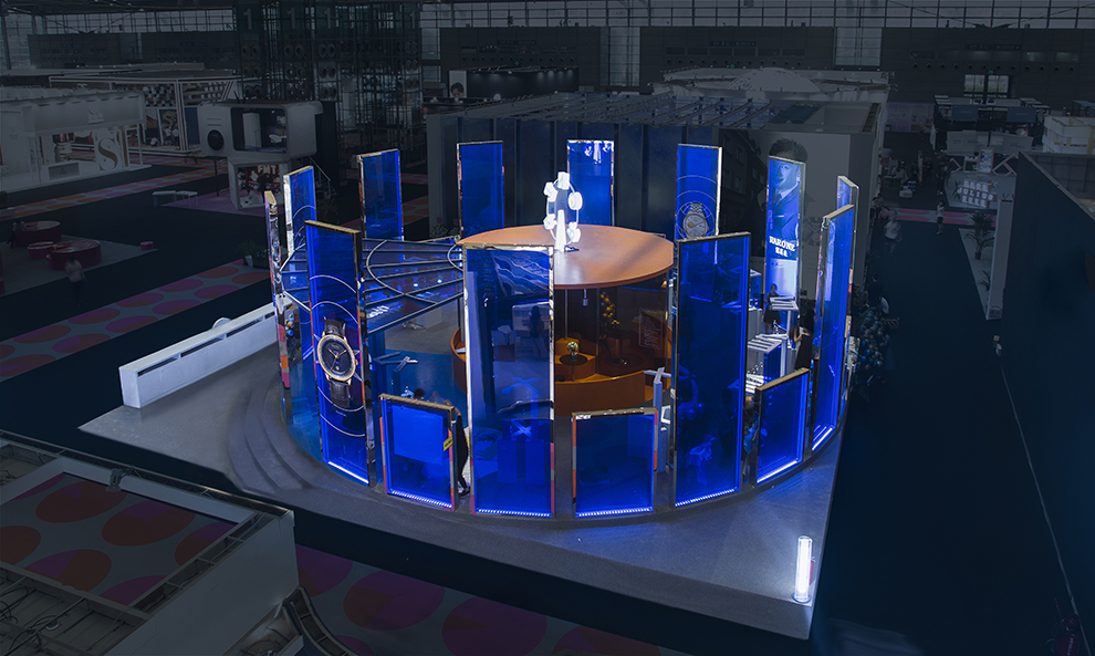 本次鐘表展,雷諾表突破以往封閉式的空間設計,以全新的垂立藍色通透亞克力作為展廳的主要裝飾,使得整個展廳充滿通透感又充極具科技特質。展廳設計為圓形,與腕表表盤的形狀相呼應,整個展廳展臺以腕表中一到十二的羅馬數字形式呈現。令觀展者仿佛置身于表盤之中,體驗奇妙的空間感,穿梭于時空之中。